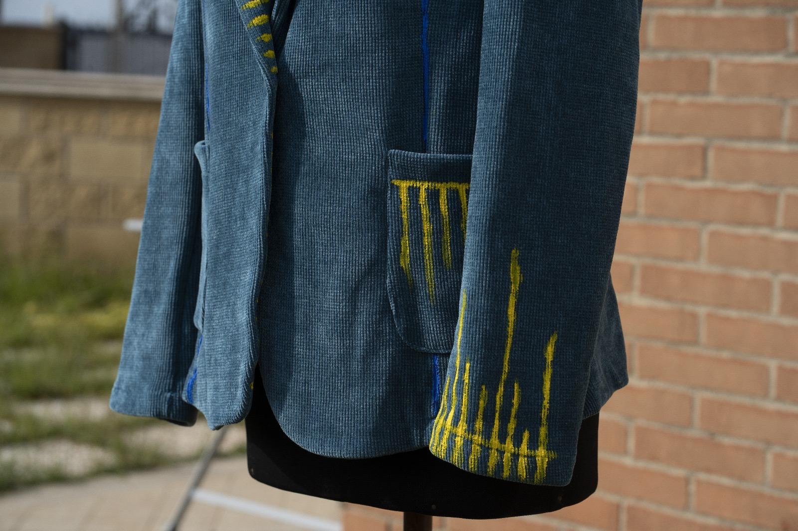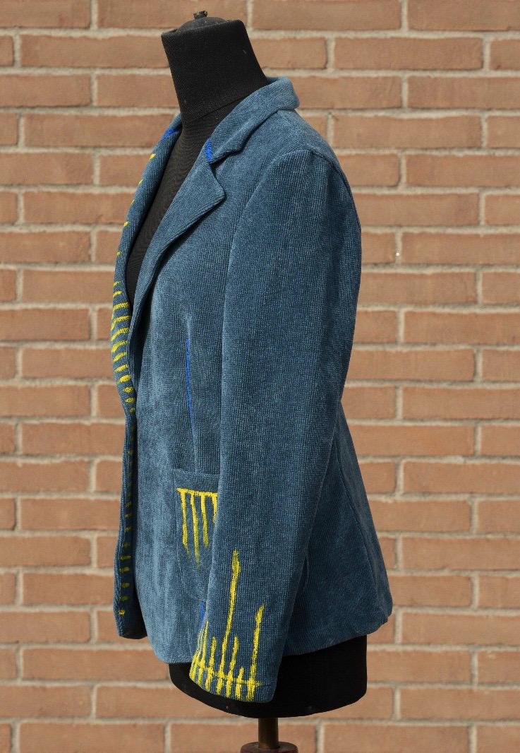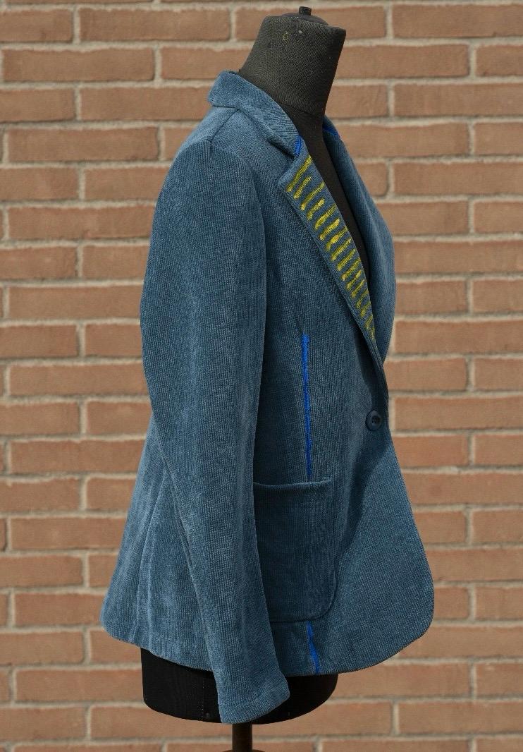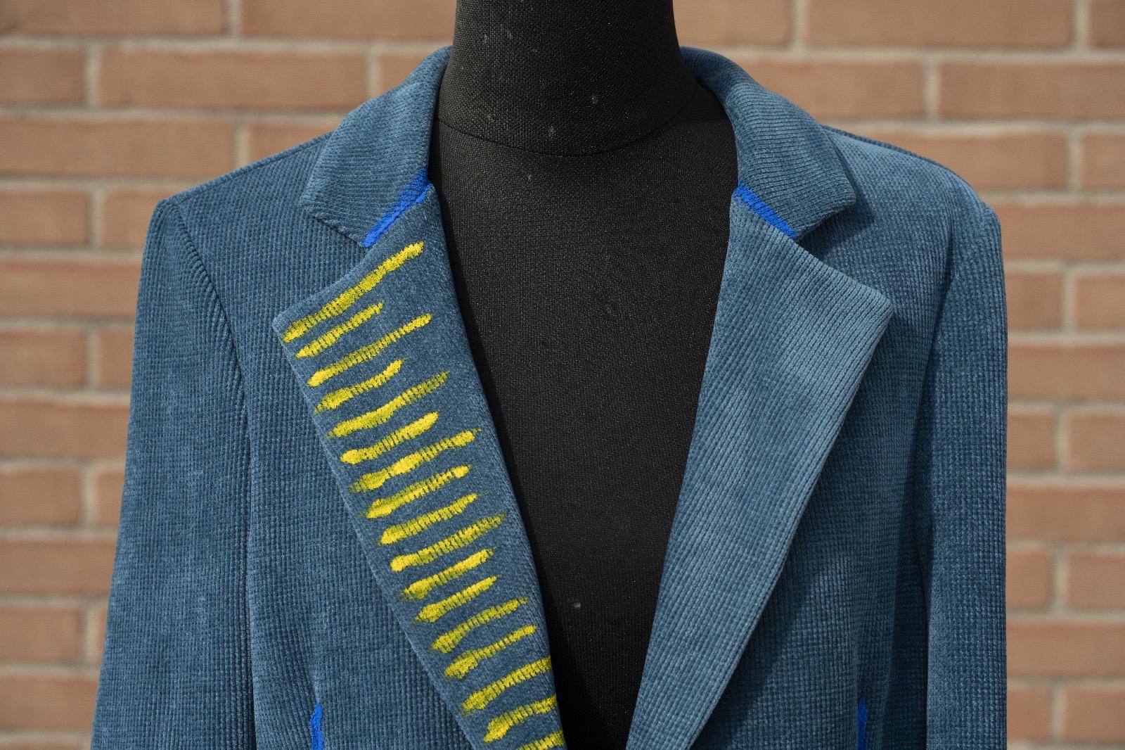 È velluto a coste, di quel blu che cambia umore con la luce. Ha carattere, personalità, presenza. L’ho immaginata mentre parla, mentre racconta. Così ho dipinto la mia energia nel velluto.