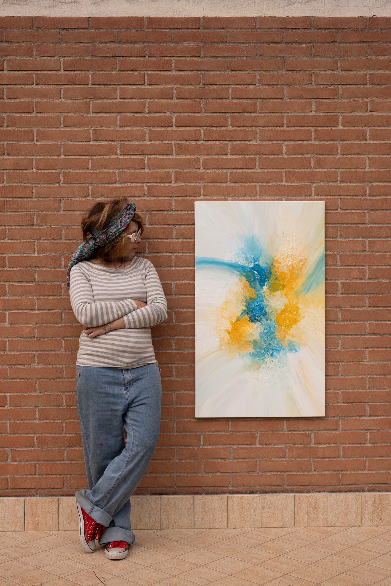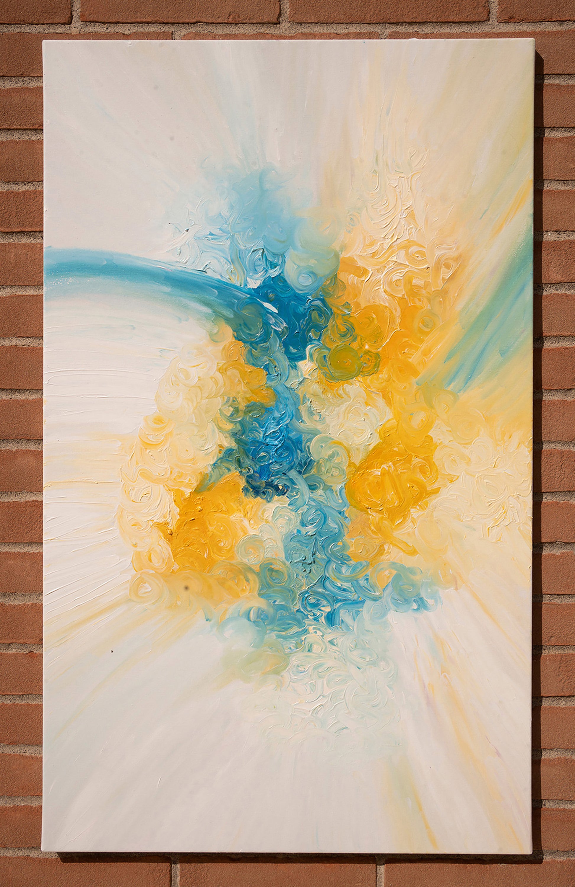 Il giallo si irradia dal centro, come un'esplosione di luce, simbolo di vitalità e calore interiore, mentre l'azzurro si fonde con esso, richiamando la profondità dei pensieri e la pace spirituale. Le pennellate circolari creano un vortice, rappresentando la complessità e la bellezza della personalità.