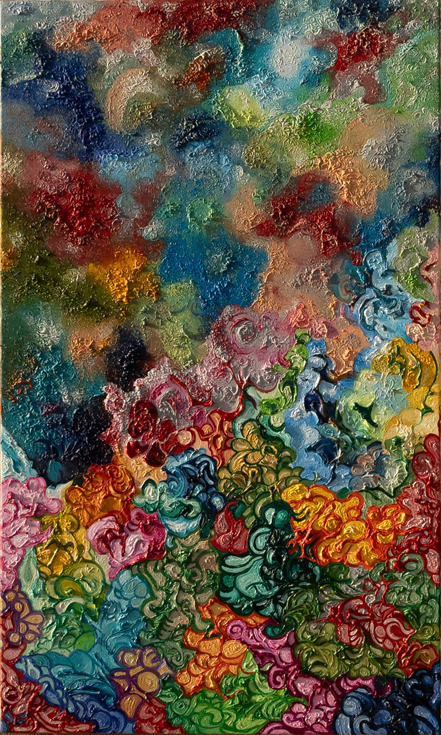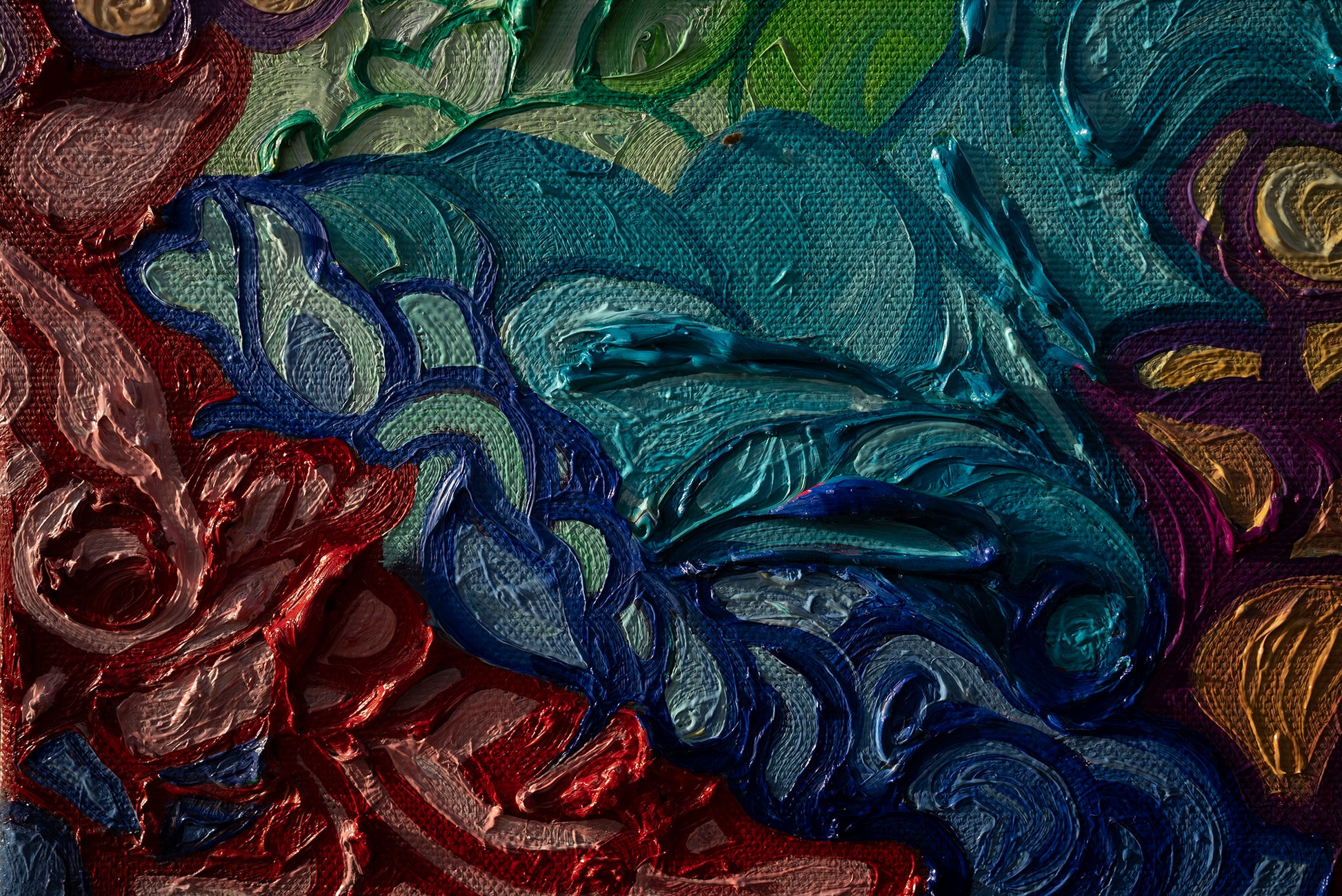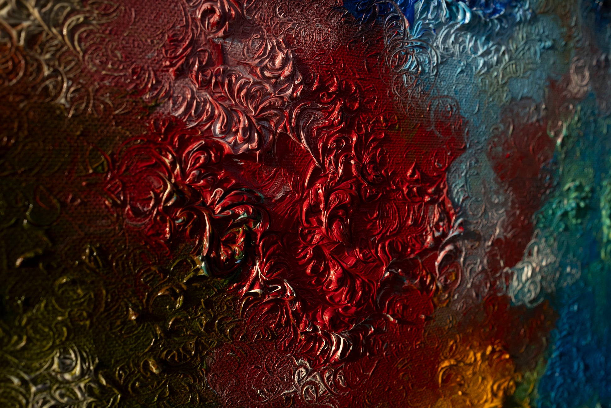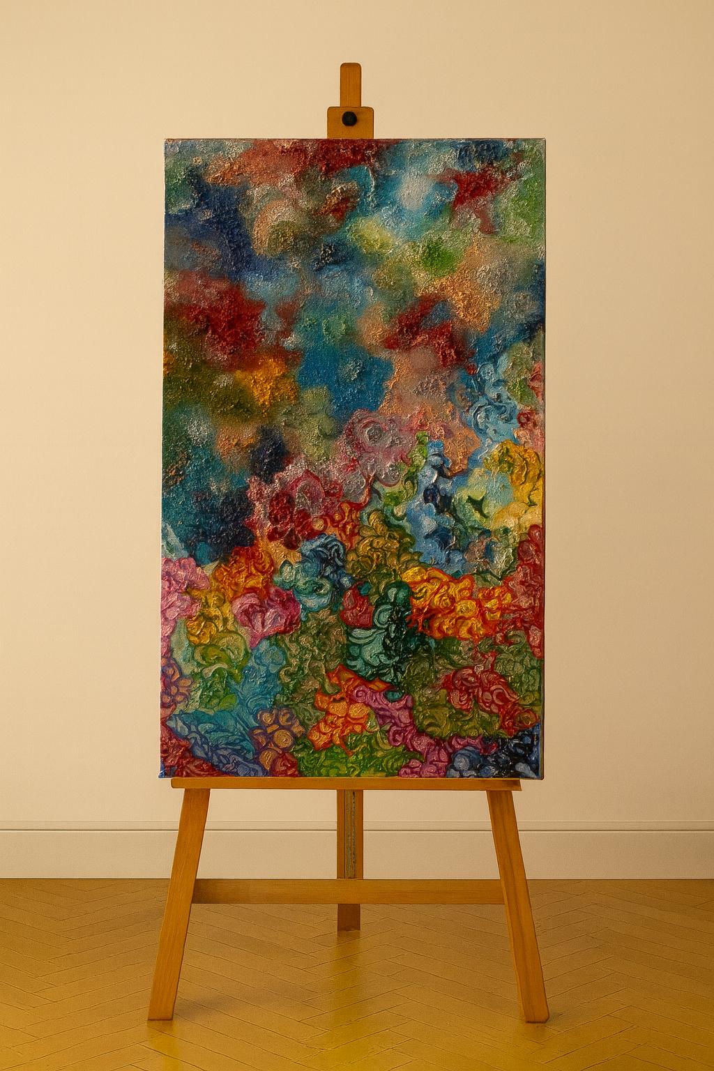 il blu profondo custodisce la sua saggezza silenziosa, il verde sussurra la speranza di un mondo rinnovato, il rosso e l’oro ardono di coraggio e potere.