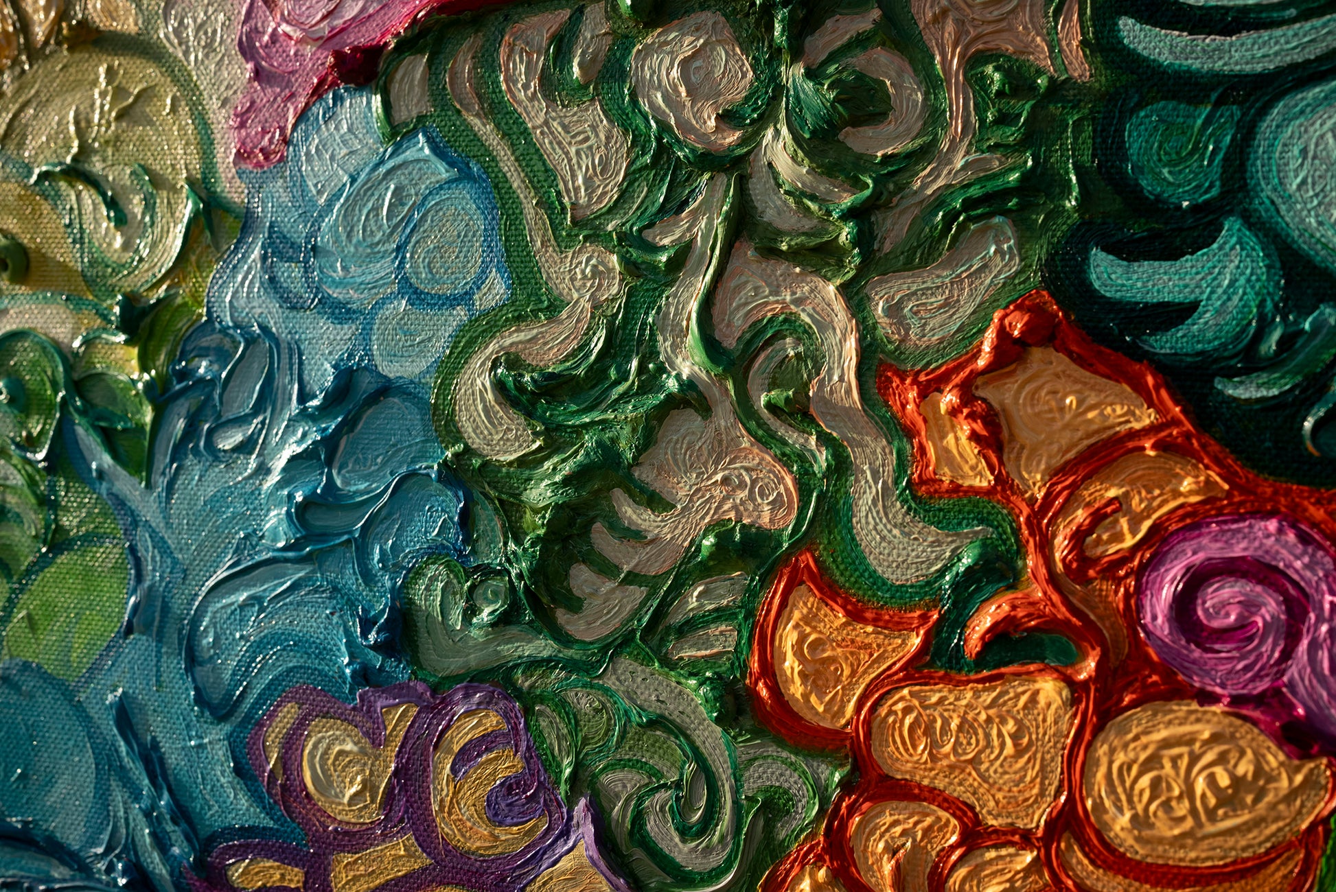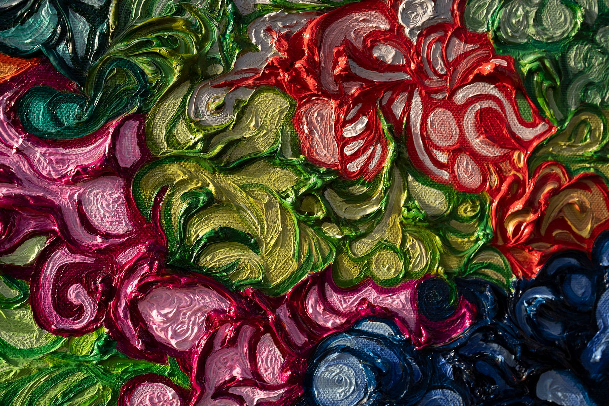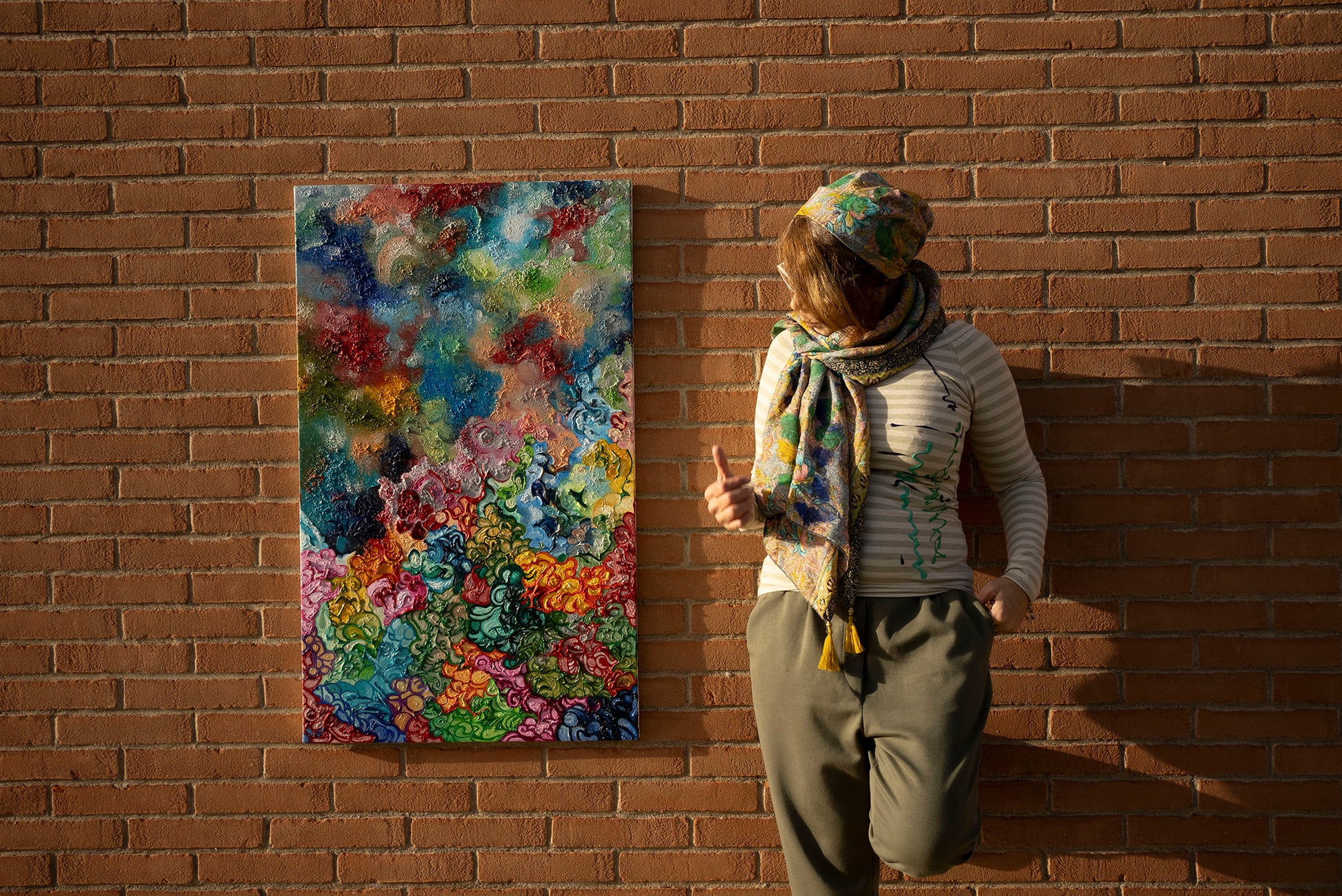 il blu profondo custodisce la sua saggezza silenziosa, il verde sussurra la speranza di un mondo rinnovato, il rosso e l’oro ardono di coraggio e potere.