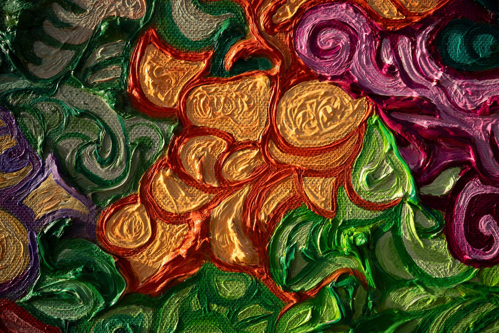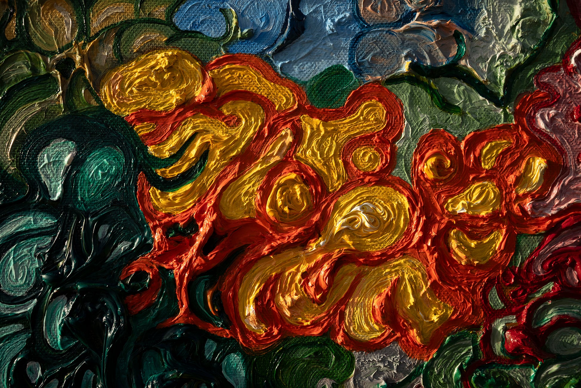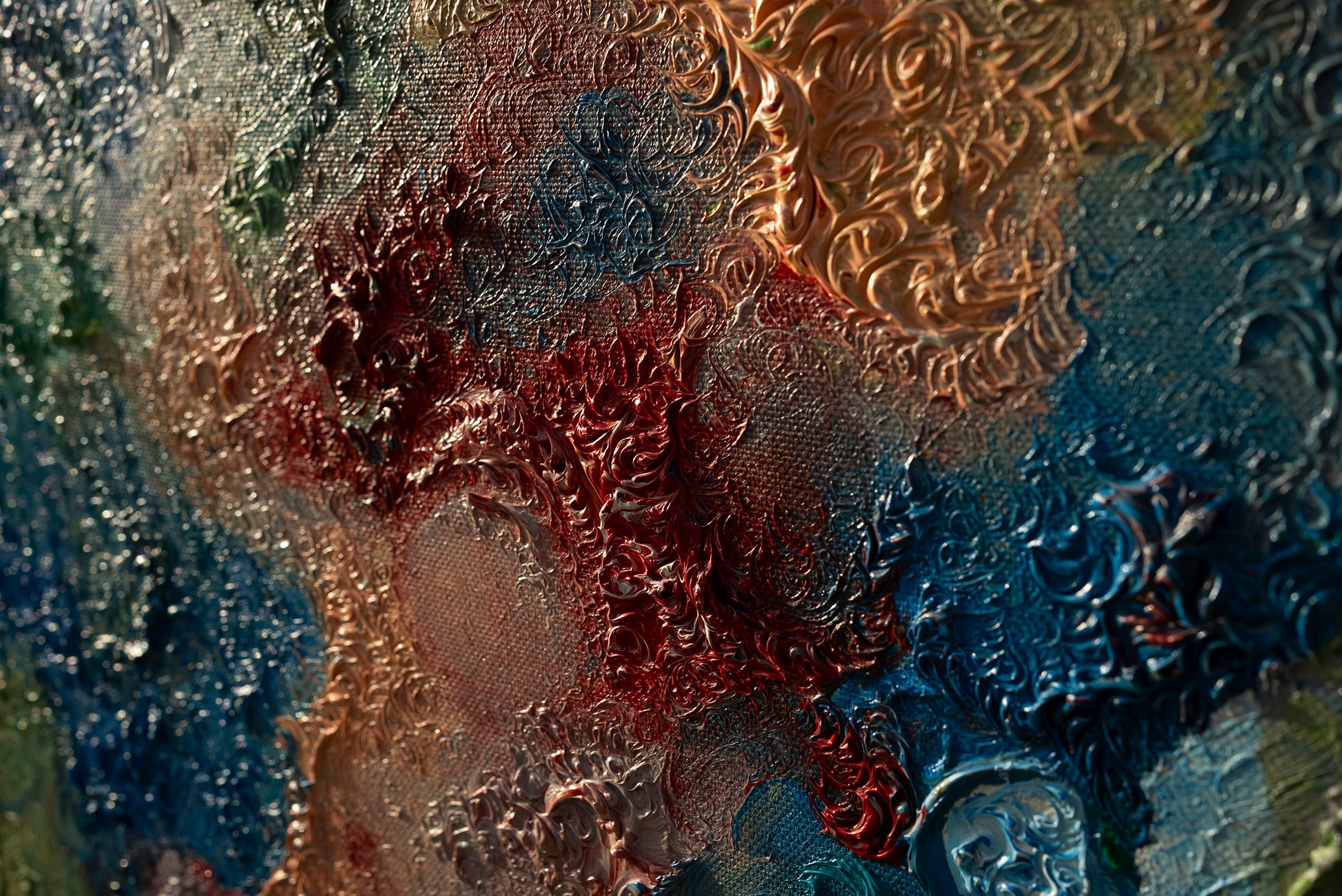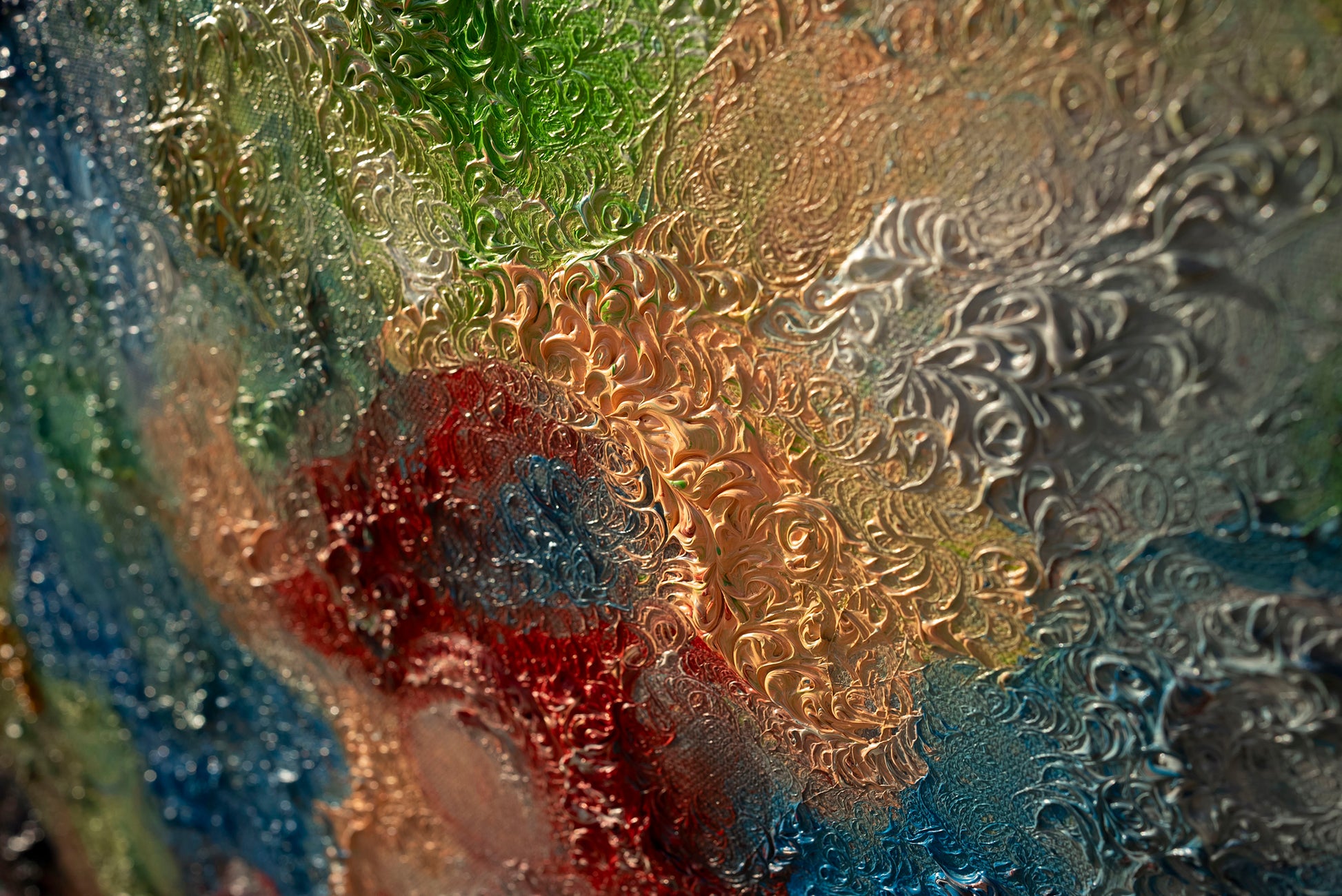 il blu profondo custodisce la sua saggezza silenziosa, il verde sussurra la speranza di un mondo rinnovato, il rosso e l’oro ardono di coraggio e potere.